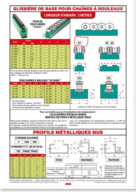 guide chaine de chez prudhomme transmission, matière "no frix", profil "GT"