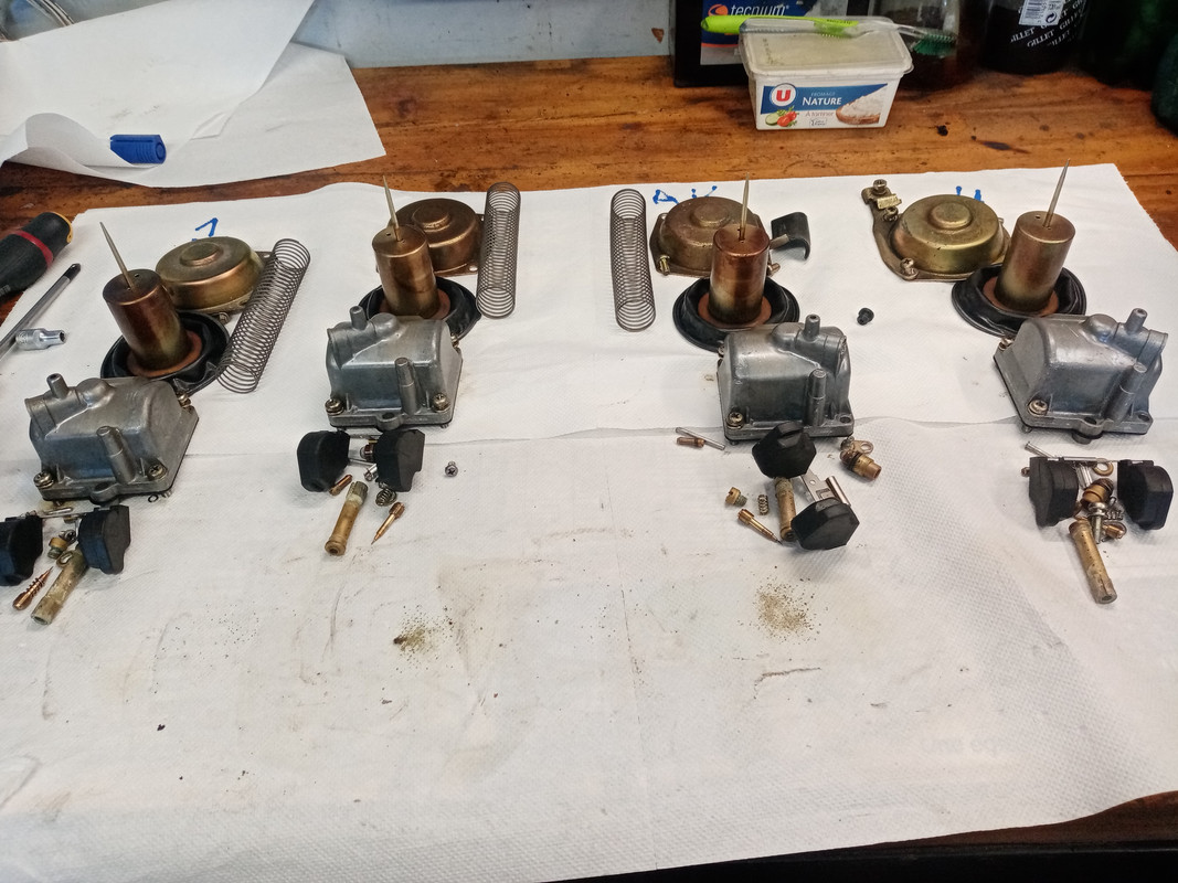 Avec l'aide d'un copain qui touche sacrement bien sa bille en mécanique, toute la rampe de carbu à été démontée et nettoyée, tous les joints remplacés. Les jeux aux soupapes ont été contrôlé avec reprise de certaines pastilles.