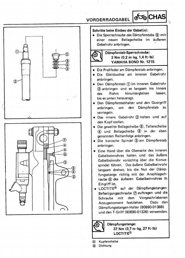 Si tu veux démonter la fourche pour changer les joints et les bagues de coulissement, il faut retirer la pipe d'amortissement 8 en la maintenant avec une longue clef mâle 6 pans de 27 mm sur plat (environ 50 cm de long, à se confectionner avec un écrou de 27 soudé sur un long tube en fer) et débloquer la vis inférieure 27 qui possède une rondelle cuivre 26. Une fois la vis sortie, tu tires sur le tube chromé avec les mains en donnant des coups répétés.